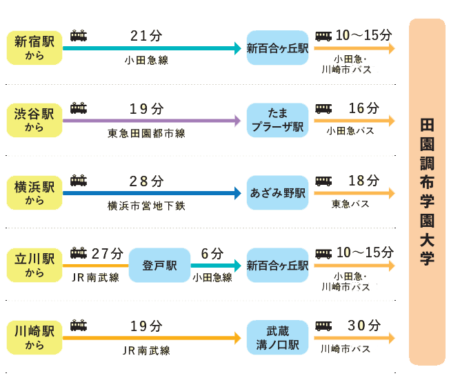 → 小田急バス⑦番のりば「田園調布学園大学行」終点下車(バス約10分)●小田急線「新百合ケ丘駅」下車