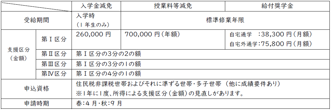 2020年4月より、国が行う修学支援で、本学は本制度の対象校として認定されました。対象者には、日本学生支援機構から給付奨学金が支給されるほか、国より入学金減免と授業料等減免を受けることができます。