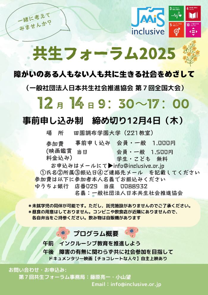 一般社団法人日本共生社会推進協会主催・田園調布学園大学地域交流センター共催による「共生フォーラム2025」を、2025年12月14日(日)9:30~17:00に本学にて開催いたします。