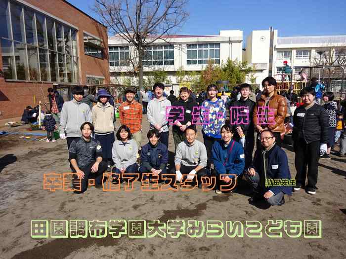 みらいこども園園庭植樹会:参加学生、院生、卒業・修了生(園職員)と記念撮影