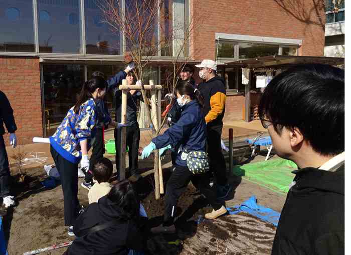 ▼学生、園児、教職員、保護者参加で、みらいこども園園庭の植樹を行いました