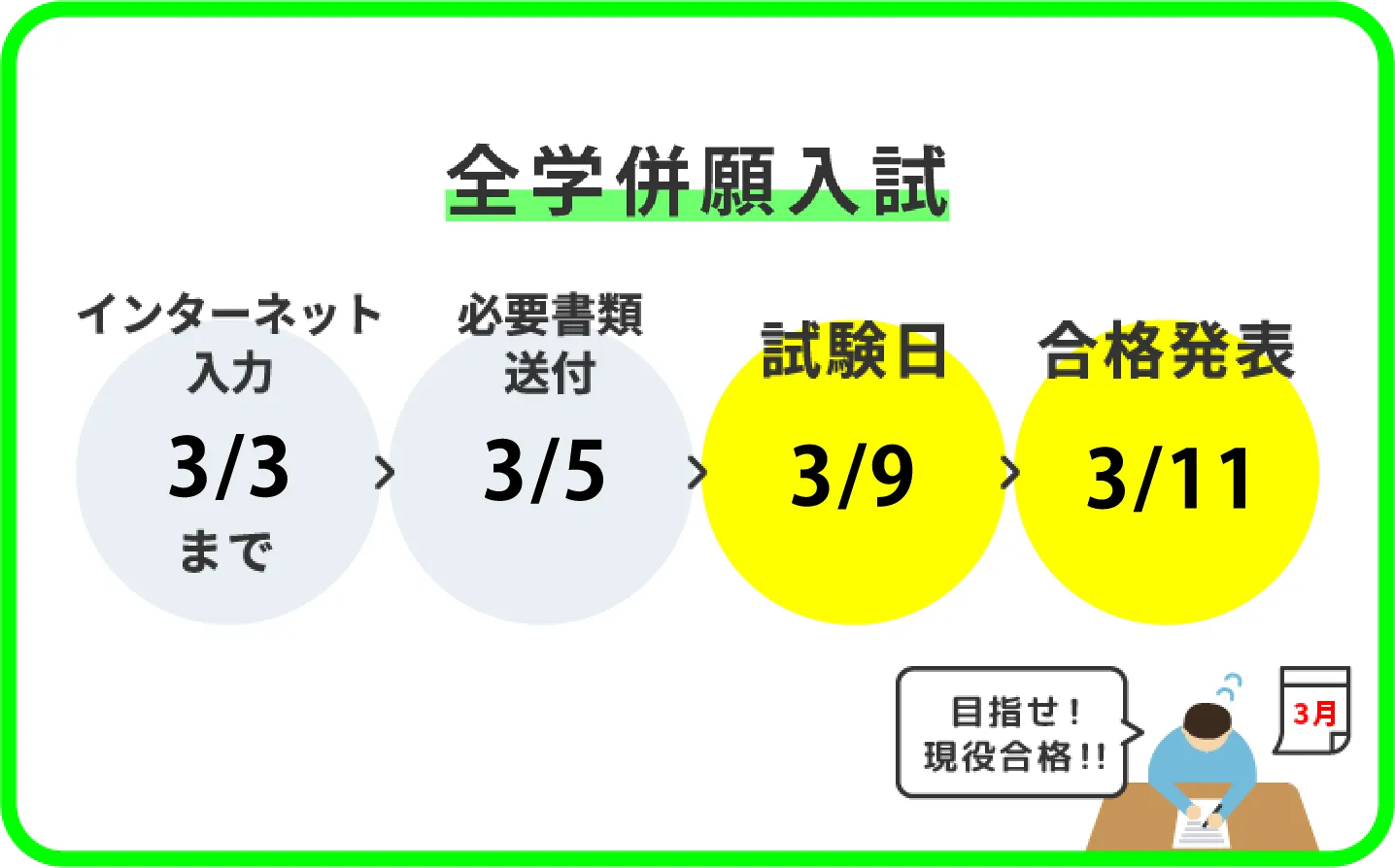 | 選抜区分 | インターネット入力期間 | 必要書類送付期限(郵送必着) | 試験日 | 合格発表 | 手続締切日 |