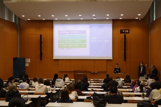 説明会では、資格取得に向けて必要な科目や実習についての説明がありました。コースによって目指す資格が違ってくるので、将来の進路を見すえて、アドバイザーと相談しつつ吟味して決めていきましょう。