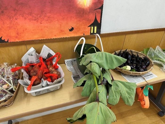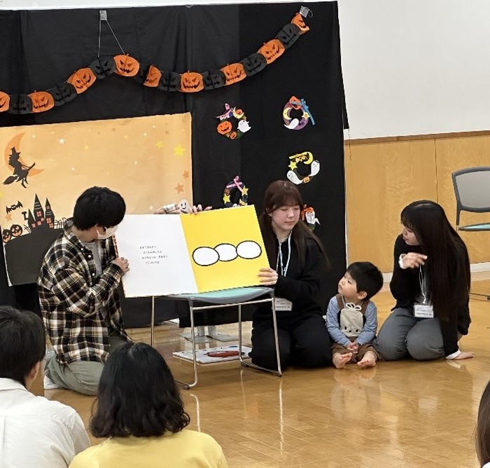 今回は18組の親子が参加してくださいました。自由遊びに始まり、学生による手遊びや大型絵本の読み聞かせ、麻生区内保育園の保育士2名(内1名は卒業生)の先生方によるスケッチブックシアターやパネルシアターも楽しみました。最後は学生が製作した手作りのフェルトバック、ハロウインのリース、大学の畑で育てた里芋や秋茄子などをお土産にお持ち帰りいただきました。笑顔あふれる楽しい会となりました。