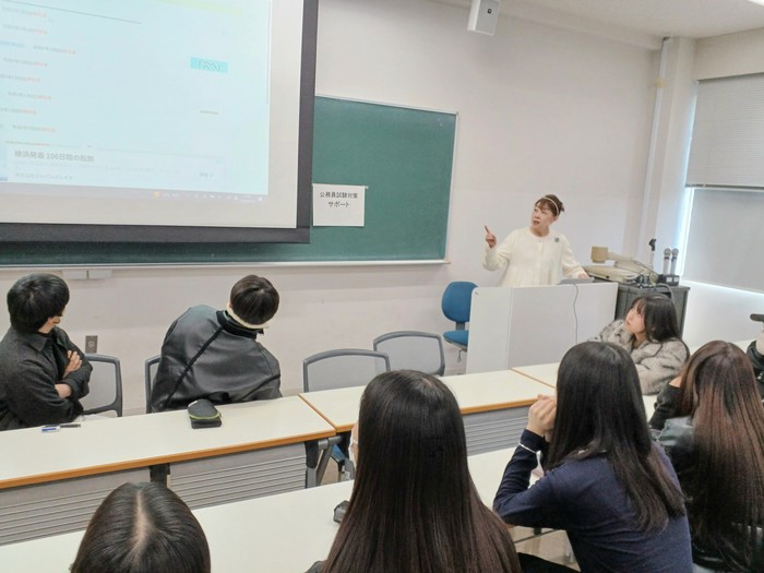 例年、子ども教育(子ども未来)学部では希望する学生に向けて公務員採用試験(保育職)対策サポートを行っています(3年生の冬~4年生の秋)。指導担当は子ども教育学部の清水道代教授。学生生活・進路支援課の進路担当も支援します。