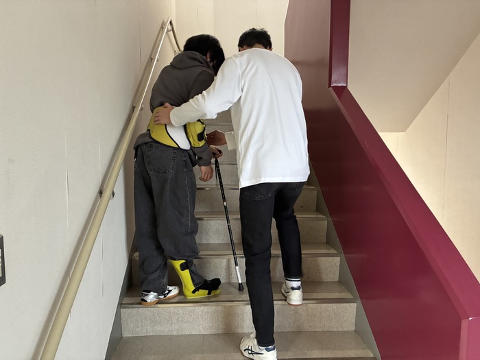 視界を制限するゴーグルや手足に重りをつけて歩行や階段昇降を試みたり、