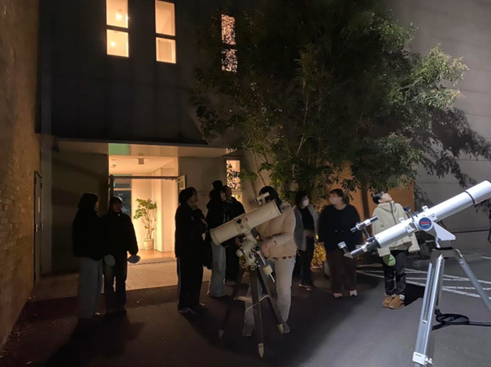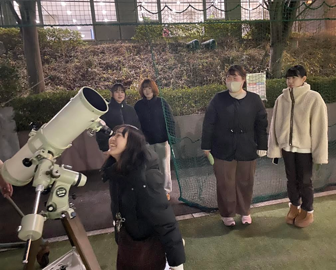 そこでコートを着て、いざ星を見つけに屋外へ! まずは東門近くでこの日のために持ち込まれた望遠鏡で、木星を発見。木星の縞模様や衛星も見えて、歓声があがりました。次は、グラウンド近くに移動し、そこでリングのある土星をついに捉えることができました。